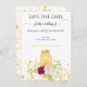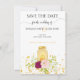 En romantiker sparar datumet för en sommarmottagning bröllop och en kvällsmottagning. Ett lysande ljus i Mason burk, magenta ro och rosa ros mot guld faux glitter. Från Candleight och Ro Bröllop Suite.