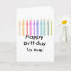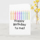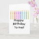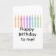 En rad med olika färg födelsedagsljus och text som lyder "Grattis på födelsedagen till mig!" på födelsedagskort, T-shirts, mugg med mera.