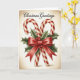 Send sweet holiday wishes with this vintage-style card featuring two red-and-white candy canes crossed and tied with a bold red ribbon. Holly leaves and berries add a festive touch, while the aged beige background and “Christmas Greetings” script evoke timeless charm.