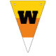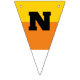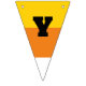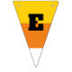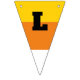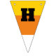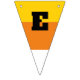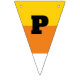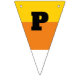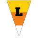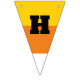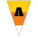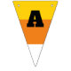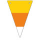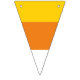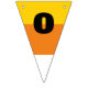 Dessa triangelformade buntar delarare har orange, gult och vitt rand för att få dem att se ut som biet i candy corn. Svart brev är ett tydligt budskap: HAPPY HALLOWEEN.
