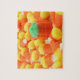 Detta gulliga Halloween pussel presenterar ett foto av candy corn och pumpor.