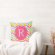 Färgfull och giftig monogramkudde med shock rosa, blått och mörk gult schevron vinkarare mönster med shock rosa scallop-kant märkre. Den här personligen blir perfekt som gåva.