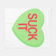 Ett grönt godis hjärta som säger "SUCK IT".