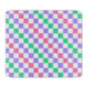A vibrant checkerboard pattern featuring alternating pastel purple, pink, and green squares against a white background, creating a playful, colorful effect.