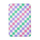 A vibrant checkerboard pattern featuring alternating pastel purple, pink, and green squares against a white background, creating a playful, colorful effect.