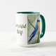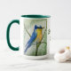 Caneca com ilustração de pássaro azul e amarelo pintado à mão em aquarela.