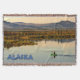 Ensam i vildmarken. En kanot ligger spegel-still vatten i sjö i insida i Alaska. I avstånd typiska taiga och berg. Texten "Alaska" visas också. Bilden kommer från ett fotografi från United Stater Fish and Wildlife Service.