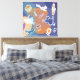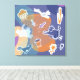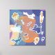 Canvas afbeelding koeien buiten in de wei met vogel, kip en bloemen. Kleur tinten blauw oranje.