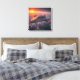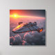 Denna science fiction-canvastryck avbildar ett silverfärgat rymdskepp med lysande orangea ljus ovanför molnen vid solnedgång.