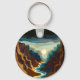 Ett vackert landskap av en kanyon med en flod i fet nyans av brunt, solblått, cyan, guld och beige.