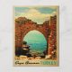 En vintage-utseendeplan med Kap Anamur i Turkiet, blå hav och himlar med stenruiner.