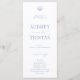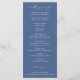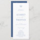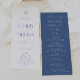 CAPE COD Coastal Blue, bröllopsprogram. Funktioner, ljusblå typografi och säsongsbild för scallop på framsidan med vit typografi och dammig marin bakgrund.