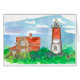 Ett tomt anteckningskort med Nauset Lighthouse på Cape Cod, Massachusetts med klarrött tak och ramlande vilda blommor från lila illustrerade med bläck och vattenfärg.