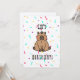 Personlig Cute Capybara med party hattfödelsedagskort med följande uttryck: Grattis på födelsedagen! Liten version och meddelande på baksidan. Capybara illustration skapas av @artbybiyan för capybara älskare.