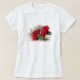 Den här fantastiska spaghetti-bandets t-shirt har två strålande röda nejlikor som är placerade på en pärlvit, präglad baksida av brockade strukturer.