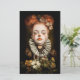 🖤 Detta konstverk kombinerar karneval noirens charm med fantasifull underlighet. Motivets centralgestalt är en flicka med invecklad frisyr i kastanjebrunt hår, prydd med en lappad båge med vintage-mönster och små dekorativa accenter. Hennes porslinsliknande ansikte är målat med teatralisk clownmakeup, inklusive känsliga tårstrimmor och en liten hjärt detalj på kinden, som frammanar en bitterljuv, romantisk stämning. Hon bär en utsmyckad klänning med randig, skrynklig krage och ett hjärtformat hänge runt halsen. Buketten med livfulla gula och vita blommor hon håller i lägger till en mjuk, naturlig kontrast till hennes dramatiska utseende. Den övergripande estetiken efterliknar rikedomarna i en oljemålning