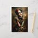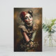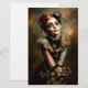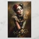 🖤 Detta konstverk kombinerar karneval noirens charm med fantasifull underlighet. Motivets är en flicka med invecklad frisyr av auburn hår, prydd med en lapptäcksbåge med vintage-mönster och små dekorativa accenter. Hennes porslinsliknande ansikte är målat med teatralisk clownmakeup, inklusive känsliga tårstrimmor och en liten hjärt detalj på kinden, som frammanar en bitterljuv, romantisk stämning. Hon bär en utsmyckad klänning med randig ruffad krage och ett hjärtformat hänge runt halsen. Buketten av livfulla gula och vita blommor hon håller i lägger till en mjuk, naturlig kontrast till hennes dramatiska utseende. Den övergripande estetiken härmar rikedomarna i en oljemålning, med varma toner