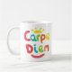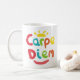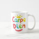 Carpe Diem, Seize The Day design shows hand drawn colorful lettering with the the sun rising above and a big smile below. Make the most of today!