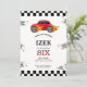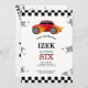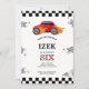 Bilkortet Cute tävling med biltemat barn med födelsedagsfest inbjudan som visar en röd bil med lågor. I texten står det "gå med tävling" designat efter heltal.