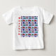 Baby t-shirt har en novelty av lastbilar och buss i rött, blått, grönt och brunt på en fält av ljusblått.