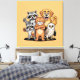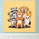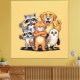 A vibrant cartoon illustration featuring a cheerful team of animal friends on a bold black background. At the center stands a confident ginger cat, surrounded by playful raccoons, a smiling golden dog, and a wide-eyed owl. With bright colors, strong outlines, and expressive personalities, this design captures friendship, teamwork, and fun. A perfect choice for fans of cute, character-driven animal art with a modern cartoon style.