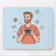 This playful cartoon illustration features a cheerful gamer holding a controller, surrounded by fun gaming and social icons in light blue accents. The energetic style and bright colors create a lively gamer vibe, perfect for anyone who loves gaming culture, streaming themes, and creative digital aesthetics. A modern, expressive design ideal for adding personality to everyday items and gaming accessories.