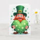 This card shows a cheerful leprechaun centered on a bright white background, smiling straight ahead with an inviting, friendly look 💚. He wears an emerald green outfit with a tall top hat topped by a gold buckle, and his orange-red beard fans out around rosy cheeks. In his gloved hands he holds a huge light-green heart covered in pale green polka dots, like a sweet token meant for a close friend. His big green eyes sparkle, and the gentle curve of his grin makes the scene feel like a warm hello shared between two people. The greeting text sits above him in green, with a smaller line below in lighter green that balances the layout ☘️. Soft light gives his rounded face and outfit subtle shading, while his sturdy brown boots show tiny stitched details near the soles. Small four-leaf clover shapes drift around him in the open white space like little accents floating near the corners.