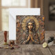 "This striking design presents a portrait of the Virgin Mary as a detailed wood carving or relief sculpture, rendered in rich, warm brown and reddish-brown tones. She is depicted with a tranquil, contemplative expression, hands clasped in prayer, and is framed by a rustic, textured halo. The rough, earthy texture of the wood grain provides a powerful sense of ancient, grounded spirituality. This design is highly suitable for products with a rustic, spiritual, or devotional theme. Imagine it on wooden plaques, religious art prints, handcrafted items, or home decor that evokes a traditional, artisan aesthetic."