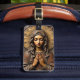 "This striking design presents a portrait of the Virgin Mary as a detailed wood carving or relief sculpture, rendered in rich, warm brown and reddish-brown tones. She is depicted with a tranquil, contemplative expression, hands clasped in prayer, and is framed by a rustic, textured halo. The rough, earthy texture of the wood grain provides a powerful sense of ancient, grounded spirituality. This design is highly suitable for products with a rustic, spiritual, or devotional theme. Imagine it on wooden plaques, religious art prints, handcrafted items, or home decor that evokes a traditional, artisan aesthetic."