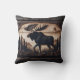 En utförlig träkarv av en älg som går genom en skog, omgiven av berg och träd, som visar upp konstnärligt hantverk.