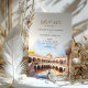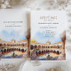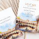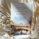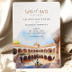 Meddela ditt kommande bröllop med detta "Spara datumet"-kort, som ger en fantastisk vattenfärgsillustration av Casa de Pilatos i Sevilla i Spanien. Konstruktionen fångar den spanska elegansens innersta väsen med en berikad gårdsvy, inramad av solbelysta bågar och klassisk andalusisk arkitektur i mjuka skuggor av terracotta, elfenben och himmel blå. Det här kortet är perfekt för ett romantiskt destinationsbröllop i Sevilla, och återspeglar det södra Spaniens charm och sofistikering. Perfekt för att ange tonen för ett firande som genomsyras av historia och skönhet.