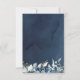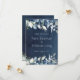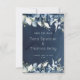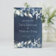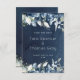 En blå bröllopsinbjudan Spara datum med vattenfärgade målade peonier och silver eucalyptus greenery mot en marin blå vattenfärgsbakgrund.