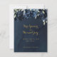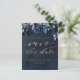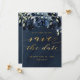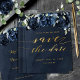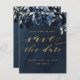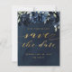 Ett marint blått bröllop spara datum-kort med marinpeonier som överlappar en dammig silvret blå grey på en mörk med en marin vattenfärgbakgrund med ett bedövande fintvättande kalligrafteckensnitt som säger "Spara datumet" i en skriven guld.
