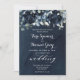 Blå kaskadpeonier med silver grenery eucalyptus foliage mot en djup blå vattenfärgsbakgrund med en vit finare-typsbyteskalligrafi som tillkännager bröllop.
