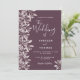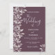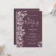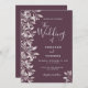 Ett trendig botaniskt bröllopsinbjudan i cassis, djup lila. . Dekorerad med dammig löv och sprit från ro färgad. Modern text med stora bokstäver, typografi med texten: bröllop i. Mallar för dina första uppgifter om namn och bröllop. Vit text. Bakåt: färgadens bakgrund för chassit.