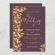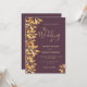 Ett botaniskt bröllopsinbjudan i trendig i kassis, djup lila och faux guld. Dekorerad med faux guld foliage och sprit. Modern text med stora bokstäver, typografi med texten: bröllop i. Mallar för information om namn och bröllop. Golden text. Bakåt: färgadens bakgrund för chassit.