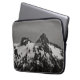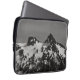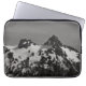 Ett svart och vitt foto av två toppar i Tatoosh-området som kallas Castle and the Pinnacle. Bergsområdet är täckt i snö trots att det är sommar. Det finns träd och sten som är spridd över landskapet och bergen. Sol ståndpunkt tillåter att skuggor kastas på berget. Inkognito moln skonar himlar. Upphovsrätt ©2023 Kimberly J Tilley. zazzle.com/store/developingnature