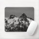 Ett svart och vitt foto av två toppar i Tatoosh-området som kallas Castle and the Pinnacle. Bergsområdet är täckt i snö trots att det är sommar. Det finns träd och sten som är spridd över landskapet och bergen. Sol ståndpunkt tillåter att skuggor kastas på berget. Inkognito moln skonar himlar. Upphovsrätt ©2023 Kimberly J Tilley. zazzle.com/store/developingnature