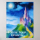 Poster i ett slott på en högtrappa med en väg fram till porten och ett nattklot med fullmåne och stjärnor. Texten påminner dig om att "följa dina drömmar".