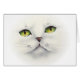 En mjuk upp nära porträtt av en vit persisk katt med slående grönt öga.