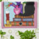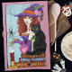 En gullig rödskalle som kör i lila med sin svarta katt sitta på en stapel av bokar. Plagg, spindel och ljus i bakgrunden av rosa