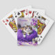 A playing cards with a sweet kitty cat sitting on a ball of purple yarn and next to a purple vase of flowers.