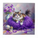 Cat in Purple Yarn and Flowers Kakelplatta