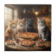 Bilden är fyra katter Sitta runt ett Bord med ett Redo i Pizza för att äta.