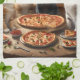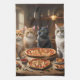 Bilden är fyra katter Sitta runt ett Bord med ett Redo i Pizza för att äta.