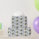 Svart och vit tuxedokatt trasslade in sig i toaletten pappert på ett vitt badrum i golv med ett blått, vitt och gult gummibadmatt under tuxedokatten.