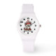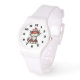 A watch with a whimsical drawing featuring a big orange red kitty cat.