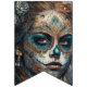 en kvinna med ett vackert målat ansikte och blommor i hennes hårstrå redo för Dias de los Muertos i turkos färg