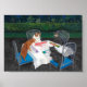 De sitter på blå kuddar runt bord med en vit bordduk. Plattor är peachy rosa. Grönt och grått-plattor. Bild av ursprunglig oljemålning "Meowjong - Cats Spela Mahjong". En sen eftermiddag satt de i trädgården för att spela roligt på Mahjongg. Snart förvandlades spelet till en katastrof, eftersom vissa av dessa feistliga kattdjur började vara oense. "Du kan inte kalla den där plattan, hon har redan slagit henne! Ja, det kan jag! Det är mitt hus, jag gör regler! För alla slitters skull, skär bara ut det och låt oss spela! Jag har inte hela dagen. Jag måste åka hem snart och ta min eftermiddagsstöt."