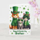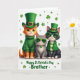 This card features three anthropomorphic cats dressed for St. Patrick’s Day, posed close together as if they’re best friends leaning in for a photo 💚. An orange cat on the left wears a green turtleneck and a tall leprechaun hat with a gold buckle, its soft smile aimed toward the others. In the middle, a grey cat adds a cool touch with green-rimmed sunglasses, a small green heart pendant, and a tiny leprechaun hat perched neatly on its head. On the right, a black cat completes the trio in green glasses, a striped shirt, and a green jacket with gold buttons, standing shoulder-to-shoulder with a gentle, affectionate look. The background is white, dotted with scattered emerald shamrocks that float around them like confetti ☘️. Near the bottom, the message “Happy St. Patrick’s Day Brother” sits as a single line of text in green, centered to anchor the scene. Around their heads and along the sides, the small shamrocks repeat in different sizes, framing the trio against the bright white space.